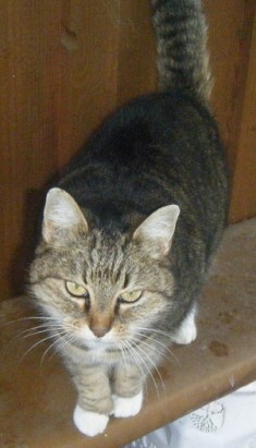 We cut a hole in the garage door and she took up residence. It was an uneasy truce. As much as she liked the food and shelter we provided, she could never bring herself to trust us. She was a tough feline with honed instincts. Even with only three legs she was fast and she was fierce. She pummeled any other cat, raccoon, possum, or chicken that got in her way. When we relocated to the Northwest I caught her in a towel and plopped her in a carrier. She uttered not a single sound during the twelve-hour drive. I suspected she might never come near us again but she did, even venturing inside for brief visits in especially cold weather. I never touched her again, although in the last few years she would sit with me outside in the sun, staying always just out of reach, occasionally rumbling out a purr.