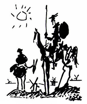 So what the devil does all the hype about Don Quixote mean to us in today’s ultra-modern and super clean world? Well, we’re still reeling from the effects of the good man’s travels and find connections in more than once place. For example, we often use the phrase “tilting at windmills” when we misperceive or misinterpret someone’s intent. This idiomatic reference is drawn directly from Cervantes’ novel and refers to a scene where Don Quixote battles windmills he imagines to be giants: